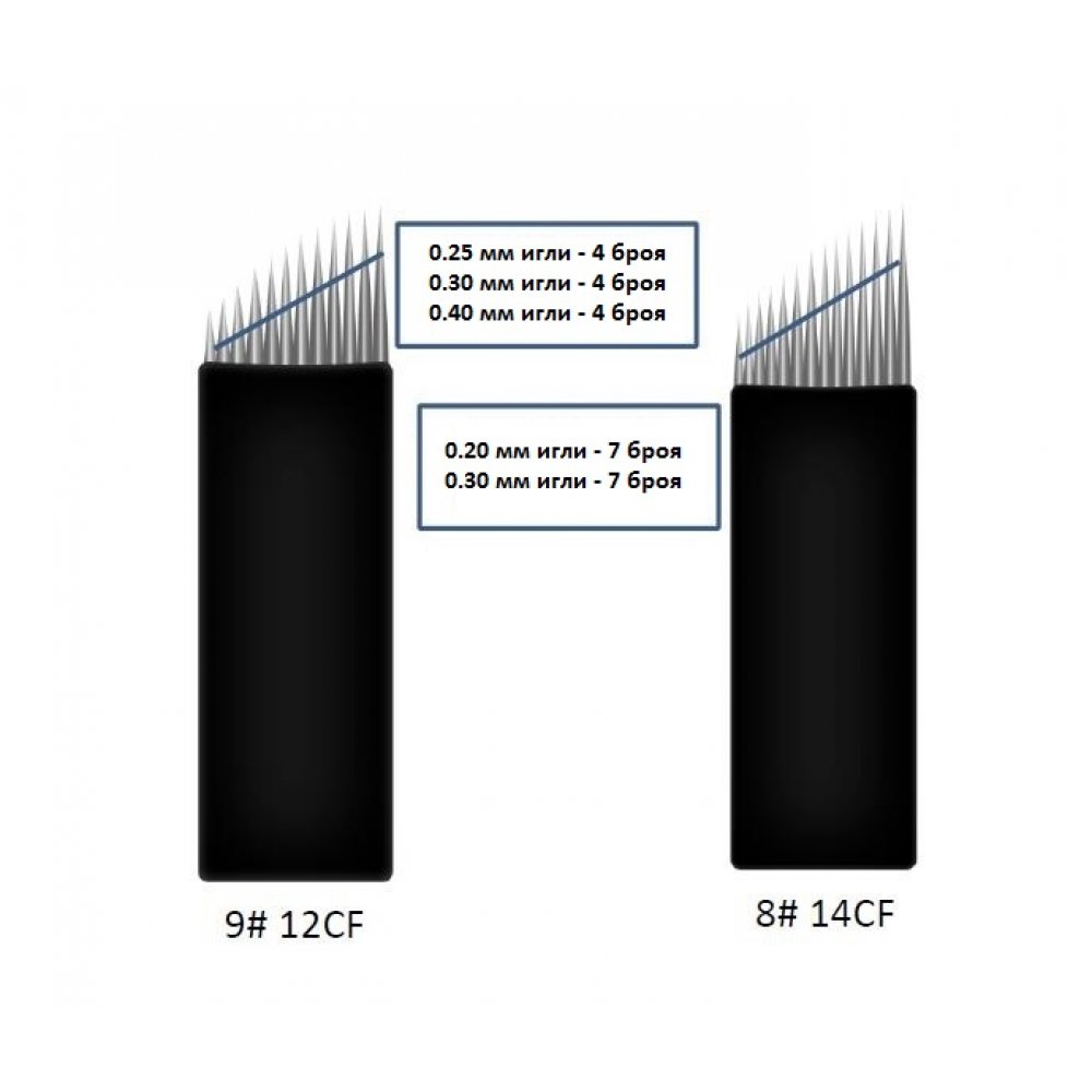 - Размер 8#14CF: Микс от 14 игли – седем игли 0.20 милиметра диаметър + седем игли 0.30 милиметра диаметър.